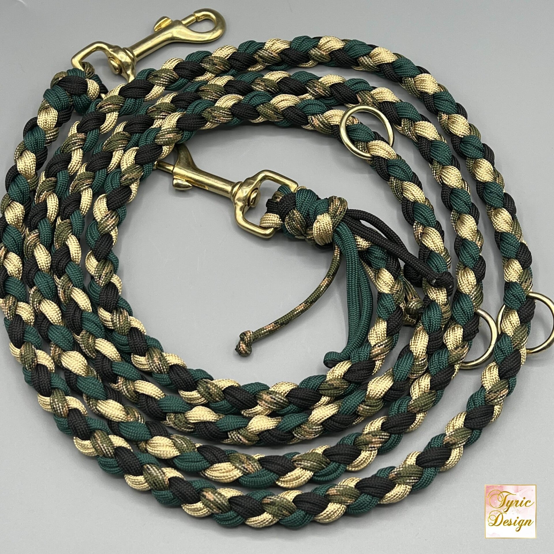 Hier handelt es sich um eine fertige Leine unseres Modells "Adrastea M" in den Farben Black-Alpine Grün-Gold und Grün Camo mit goldfarbenen Beschlägen. Die Leine hat eine Länge von 2m.