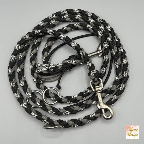 Hier handelt es sich um eine fertige Leine unseres Modells "Adrastea M" in den Farben schwarz, meliert und grau mit silberfarbenen Beschlägen. Die Leine hat eine Länge von 2m.