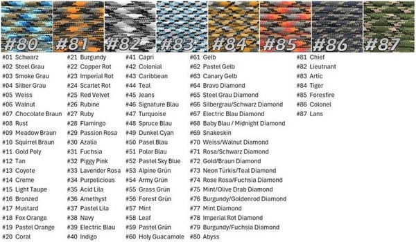 In den Fotos seht ihr auch eine Nummerierung des Paracords in dem Halsband. Bitte gebt also genau an, was ihr als Farbe 1, Farbe 2, Farbe 3 und Farbe 4 haben möchtet.
