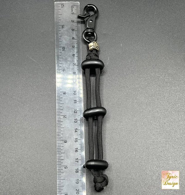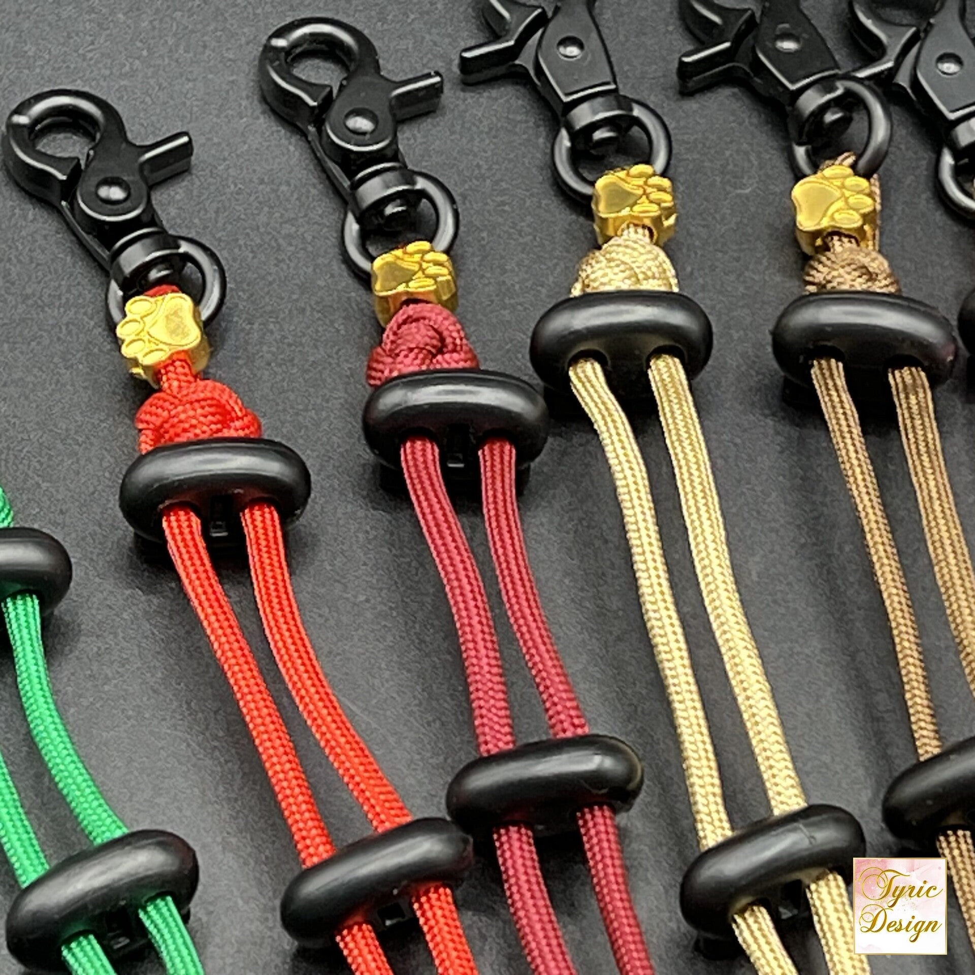 Gefertigt wurden die Halter aus Paracord Type III. Die Schmuck-Pfötchen als Deko sind aus Zinkguss. Die Farben der Pfoten-Perlen variieren je nach Paracord-Farben. Das könnt ihr in den Fotos erkennen :)