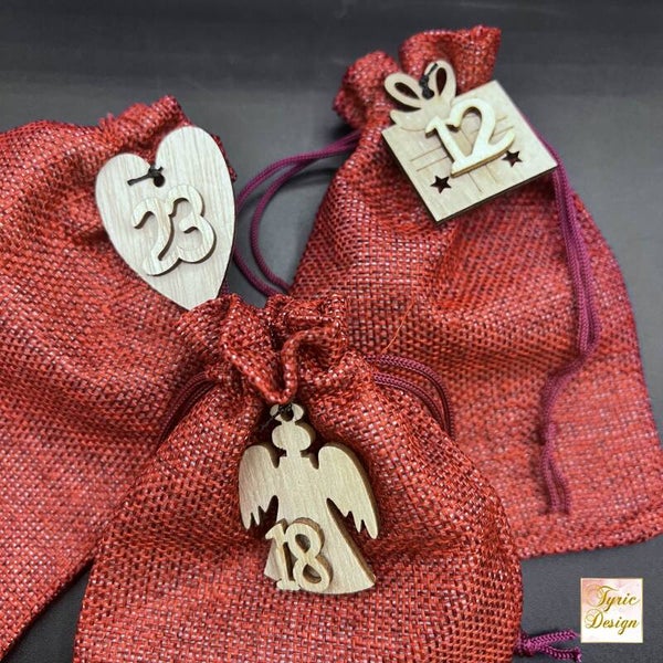 Die Jute-Säckchen sind farblich auch frei wählbar - es können auch gerne zwei verschiedene Farben gewählt werden. Die Nummern aus Holz werden entsprechend an den Säckchen befestigt.