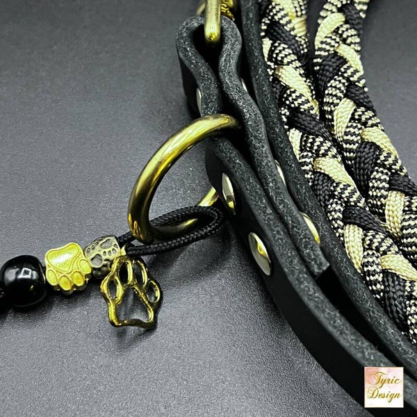 Unsere "Gilded Noir"-Leine besteht aus schwarzem Leder und gold-schwarz-farbenem Paracord. Die Flechtung ist unsere Flechtungsart Andromeda.