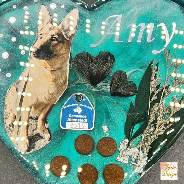 Auf den Fotos ist unser Erinnerungsstück an unsere Hündin Amy. Darauf ist ersichtlich, was alles möglich ist: Fell in Herform, getrocknete Blumen/Pflanzen, Lieblings-Leckerchen (wenn sie trocken sind).