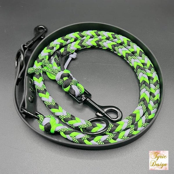 Die Leine hat eine Länge von ca. 2 Metern - bestehend aus einer Hälfte Biothane und einer Hälfte Paracord. Biothane ist ein sehr stabiles Gurtband, welches zum einen sehr leicht zu reinigen ist und dazu noch schimmelresistent. Feuchtigkeit ist also absolut kein Problem. Ein Paracordstrang hat eine Bruchlast von 249kg lt. Hersteller.