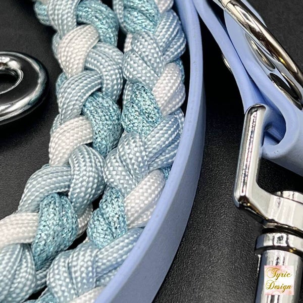 Die Leine hat eine Länge von ca. 2 Metern - bestehend aus einem Teil Biothane und einem Teil Paracord. Biothane ist ein sehr stabiles Gurtband, welches zum einen sehr leicht zu reinigen ist und dazu noch schimmelresistent. Feuchtigkeit ist also absolut kein Problem. Ein Paracordstrang hat eine Bruchlast von 249kg lt. Hersteller.