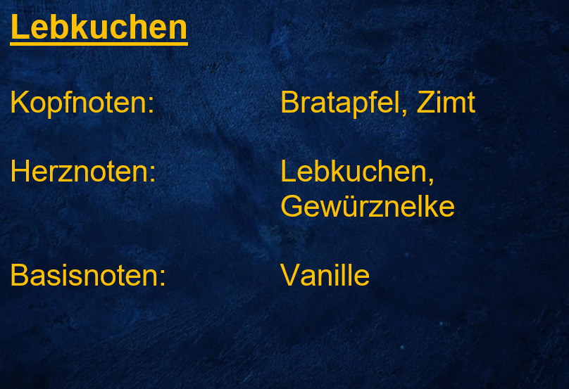 Der Kern: Darauf folgt die reiche, goldbraune Süße des Lebkuchens selbst, untermalt von einem Hauch kandierter Orange. Der Duft wird tief und umarmend, ideal für lange Abende mit einem Buch und einer heißen Tasse Tee.